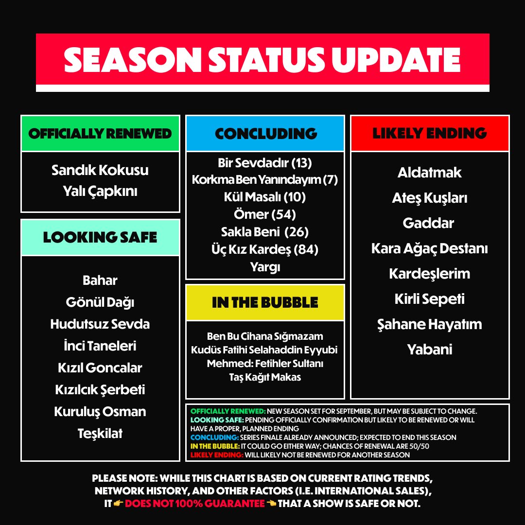 Kardeşlerim bu tabloya göre bitmesi yüksek ihtimal verilmiş. Aynı şekilde Şahane Hayatım, Gaddar ve Yabani içinde aynı durum geçerli.