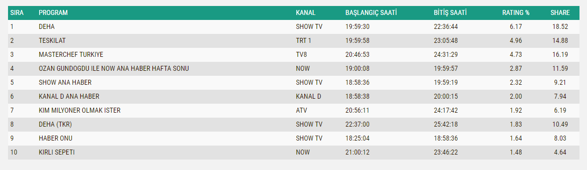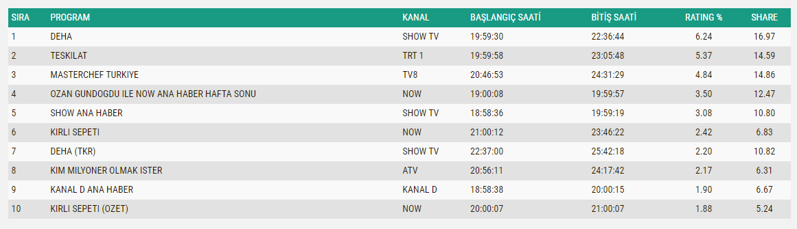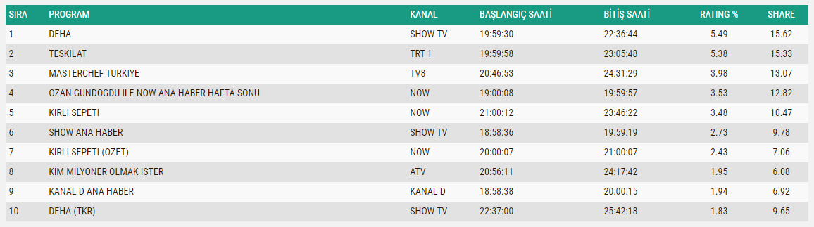 Tabii ki 4-5 hafta daha denesinler ama ikisinin de yükseleceğini sanmıyorum, ha belki de Deha düşecek, Teşkilat zaten çok yoruldu, bunlar düşük ihtimal ama her şey olabilir...