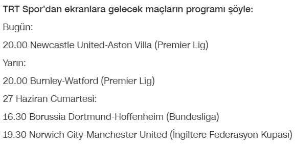 24 Haziran 2020'deki TRT Spor'da yayınlanacak maçların haberi: