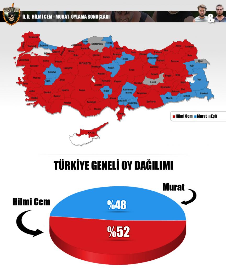 Survivor Ünlüler-Gönüllüler de bu hafta dokunulmazlığı iki gönüllü yarışmacı da kazanamadı. Hilmicem ve Murat SMS'e kaldı. Ve SMS sonuçlarına göre K.K.T.C'nde elenen isim Murat oldu. Hilmicem Muratı çok küçük bi farkla eledi. Hilmicem %52 Murat ise %48 aldı.